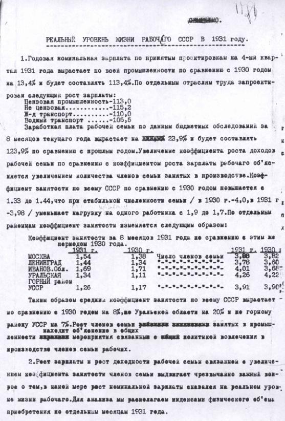 Справка ЦУНХУ о реальном уровне жизни рабочего в 1931 году.