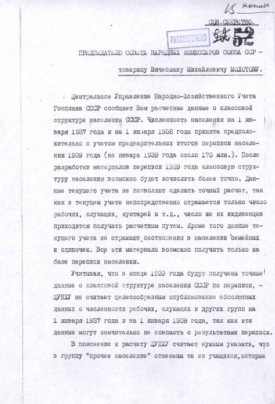 Справка ЦУНХУ на имя В.М.Молотова о классовой структуре населения СССР. 5 марта 1939 г.