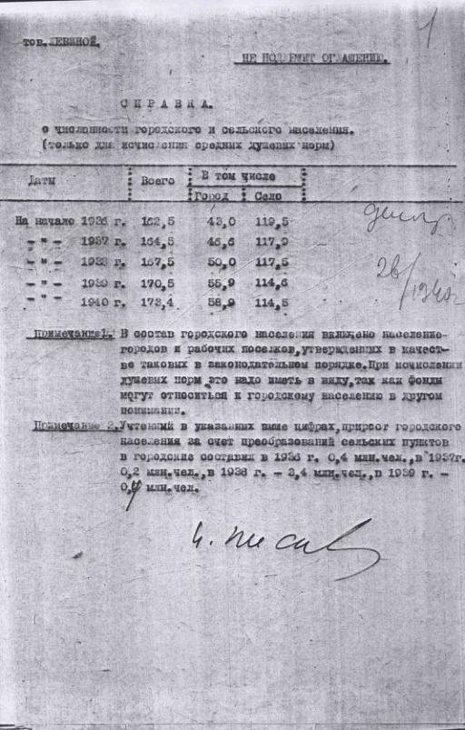 Справка о численности населения СССР в 1927-1940 годах для исчисления душевых норм.