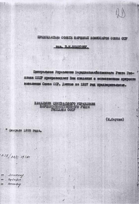 Справка ЦУНХУ на имя В.М.Молотова о предварительных итогах переписи населения на 1 февраля 1939 года.