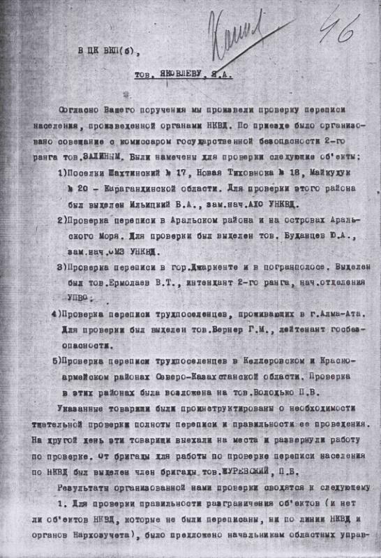 Докладная записка заместителю председателя КПК Я.А.Яковлеву о результатах проверки переписи населения 1937 года в Казахской ССР, произведенной органами НКВД..