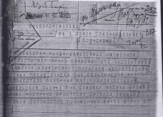 Телеграммы В.В. Осинскому с указанием размеров текущего урожая. Октябрь 1932 г.