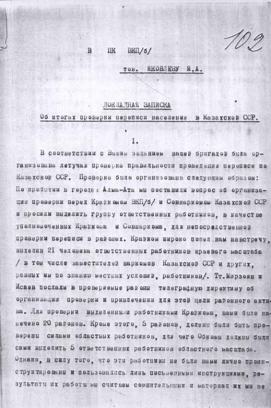 Докладная записка заместителю председателя Комиссии Партийного Контроля Я.А.Яковлеву о результатах проверки переписи населения 1937 года в Казахской ССР.