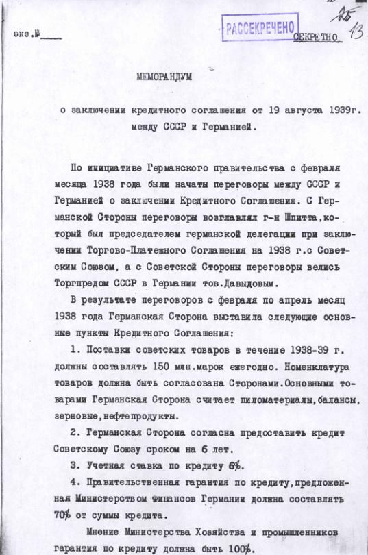 Меморандум о заключении кредитного соглашения от 19 августа 1939 г. между СССР и Германией. Июль 1940 г.