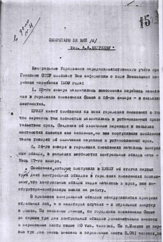 Справка секретарю ЦК ВКП(б) А.А.Андрееву о ходе проведения Всесоюзной переписи населения СССР 1939 года. 31 января 1939 г.
