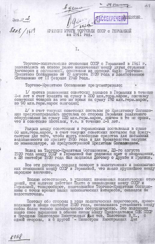 Отчет о результатах хозяйственных взаимоотношений между СССР и Германией с августа 1939 г. по 22 июня 1941 года.