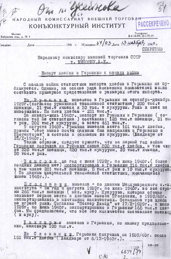 Справка об импорте хлебов в Германию в 1939 и 1940 гг. 13 ноября 1940 г.