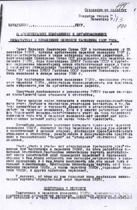 Закрытое письмо Бюро Всесоюзной переписи населения 1939 года "О вредительских извращениях и организационных недостатках в проведении переписи населения 1937 г." 10 декабря 1937 г.