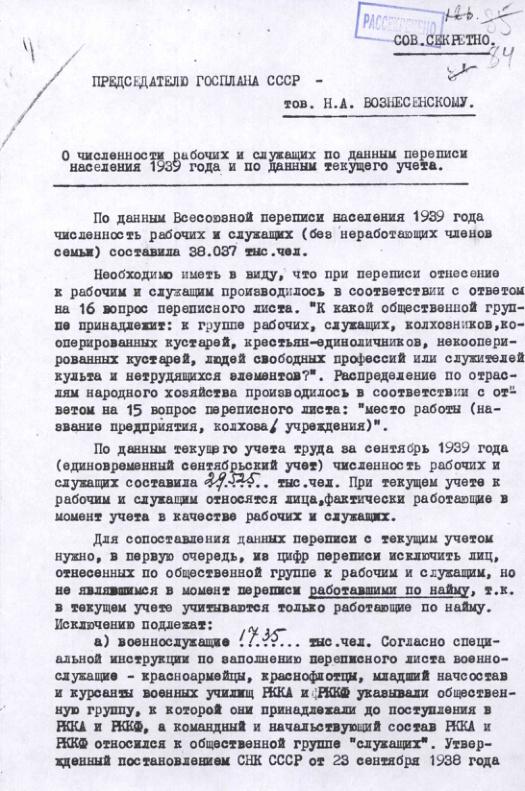 Записка о численности рабочих и служащих по данным переписи населения 1939 г. и по данным текущего учета. 6 августа 1940 г.