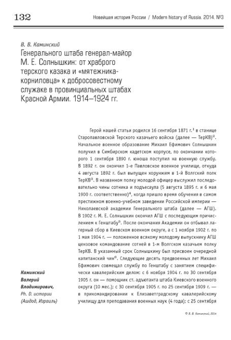 Генерального штаба генерал-майор М. Е. Солнышкин: от храброго терского казака и «мятежника- корниловца» к добросовестному служаке в провинциальных штабах Красной Армии. 1914-1924 гг.