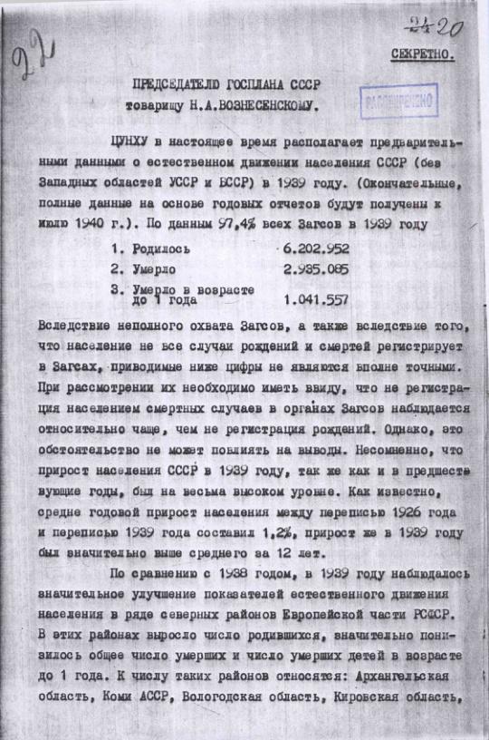 Справка ЦУНХУ с предварительными данными о естественном движении населения СССР за 1939 год. Март 1940 г.