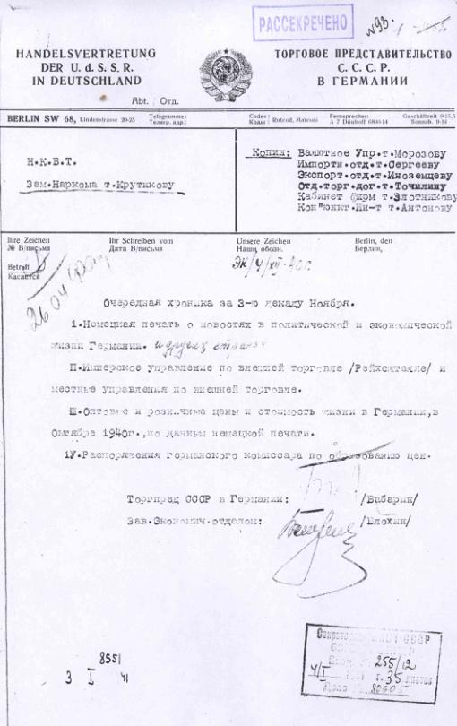Обзор Торгового представительства СССР в Германии о политико-экономических событиях за 3-ю декаду ноября 1940 г.