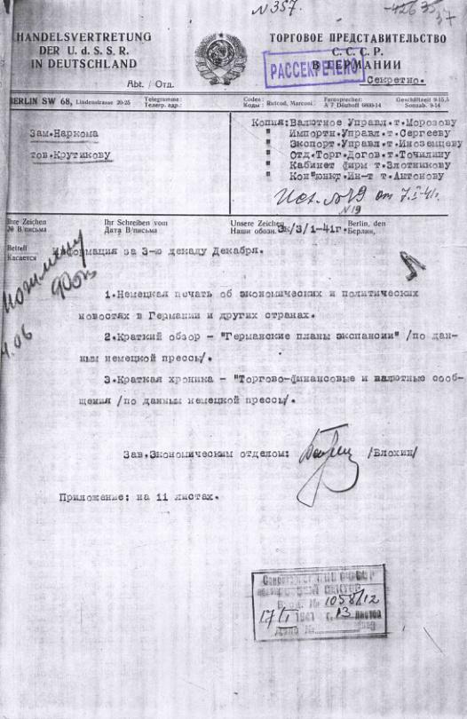 Обзор Торгового представительства СССР в Германии о политико-экономических событиях за 3-ю декаду декабря 1940 г.
