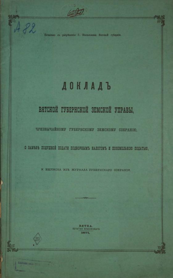 Доклад Вятской Губернской Земской Управы Чрезвычайному Губернскому Земскому Собранию о замене подушной подати подворным налогом и поземельной податью