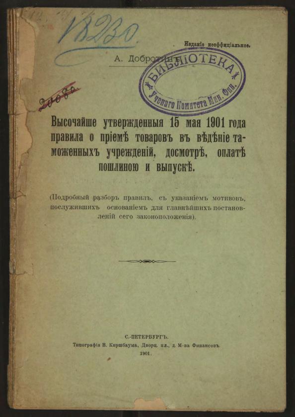 Высочайше утвержденные 15 мая 1901г. правила о приеме товаров в ведение таможенных учреждений, досмотре, оплате пошлины и выпуске