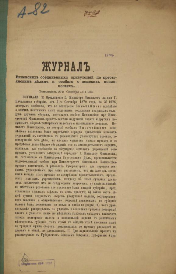 Журнал Виленских соединенных присутствий по крестьянским делам и особого о земских повинностях