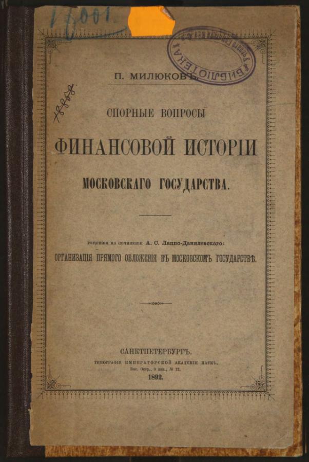 Спорные вопросы финансовой истории Московского государства. Рецензия на сочинение А.С. Лаппо-Данилевского: Организация прямого обложения в Московском государстве