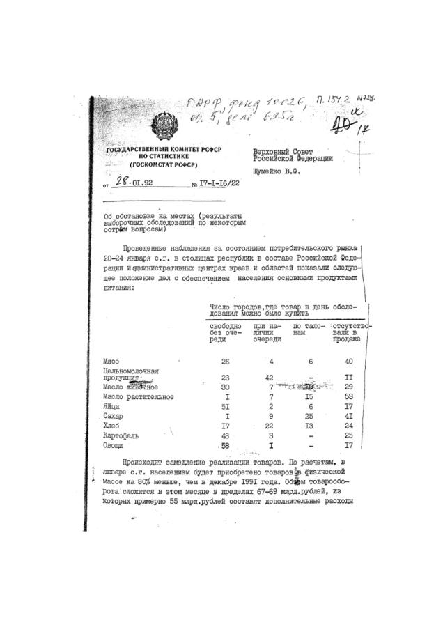 Госкомстат – ВС РФ Шумейко В.Ф. Об обстановке на местах (результаты выборочных обследований по некоторым острым вопросам).