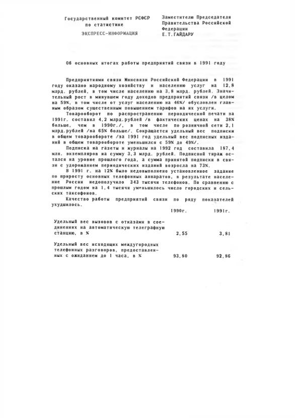 Госкомстат - Гайдару Е.Т. Об основных итогах работы предприятий связи в 1991 г.