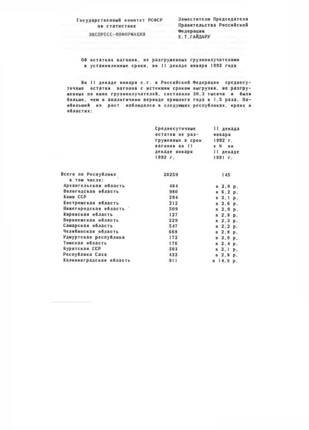 Госкомстат - Гайдару Е.Т. Об остатках вагонов, не разгруженных грузополучателями в установленные сроки, во II декаде января 1992 г.