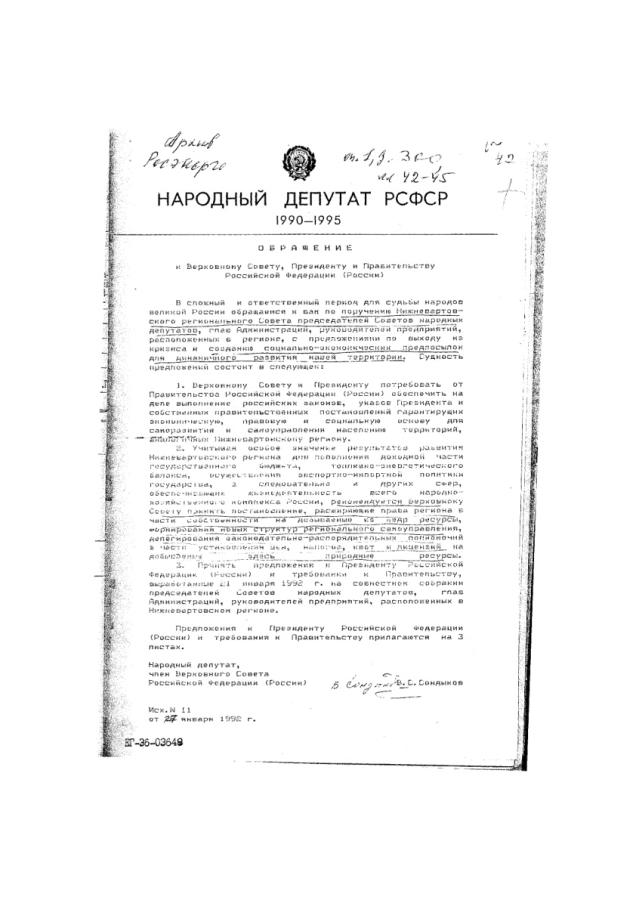 Народный депутат РФ Сондыков В.С. – в Верховный Совет РФ, Президенту и Правительству. Обращение по поручению Нижневартовского регионального совета депутатов с предложениями по выходу из кризиса и созданию социально-экономических предпосылок для развития.