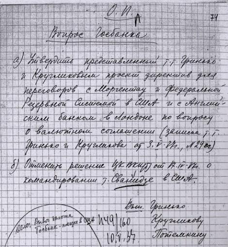 Постановление Политбюро ЦК ВКП(б) п. 49/160 "Вопрос Госбанка" с приложением записки Г.Ф. Гринько. 10 мая 1937 г.