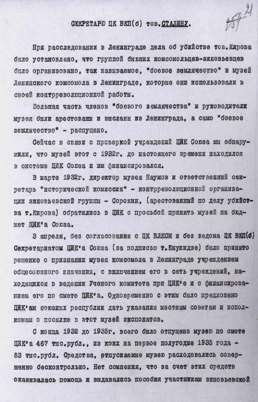 Записка Н.И. Ежова на имя И.В. Сталина о финансировании ЦИКом СССР Всесоюзного музея ленинского комсомола. Апрель 1935 г.