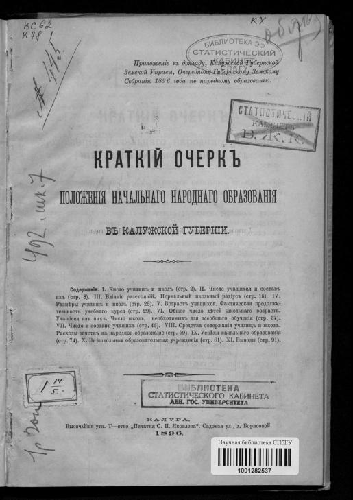 Краткий очерк положения начального народного образования в Калужской губернии 1896