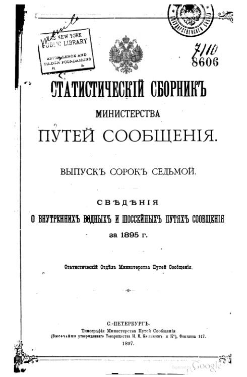 Статистический сборник Министерства путей сообщения. Выпуск 47. Сведения о внутренних водных и шоссейных путях сообщения за 1895 г.