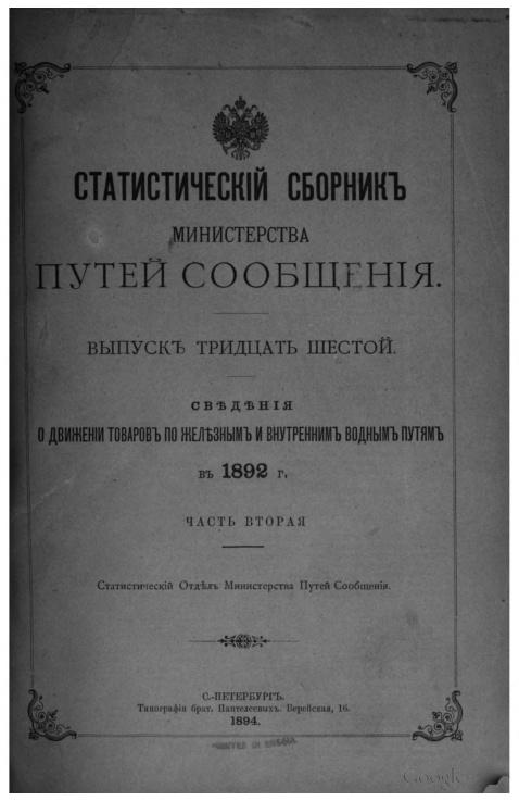 Статистический сборник Министерства путей сообщения. Выпуск 36. О движении товаров по железным и внутренним водным путям в 1892. Часть 1