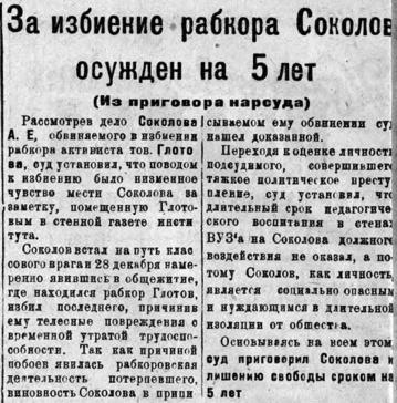 За избиение рабкора Соколов осужден на 5 лет. Из приговора нарсуда. Январь 35 г.