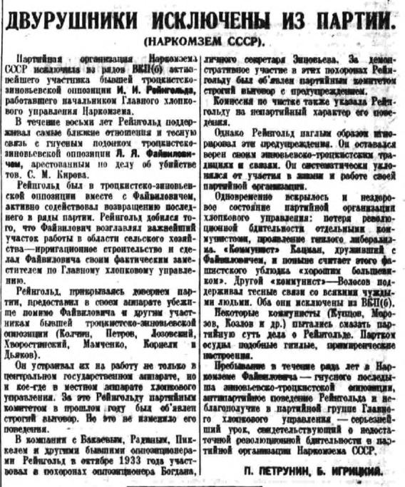 Двурушники исключены из партии. Наркомзем СССР. Январь 35 г.