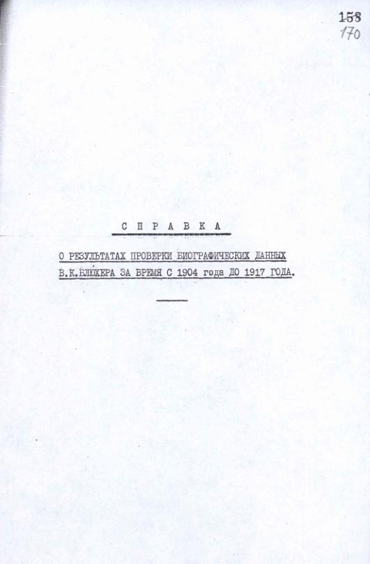Справка о результатах проверки биографических данных В.К. Блюхера в период 1904-1917 г.г. 26 августа 1938 г.
