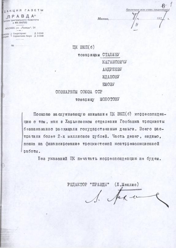 Записка редактора газеты "Правда" Л.З. Мехлиса с приложением статьи о злоупотреблениях в Харьковском областном отделении Госбанка. 8 февраля 1937 г.