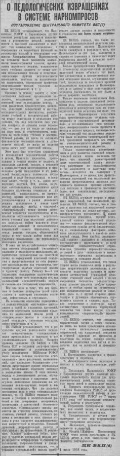 Постановление Центрального Комитета ВКП(б) о педологических извращениях в системе Наркомпросов. 4 июля 1936 г
