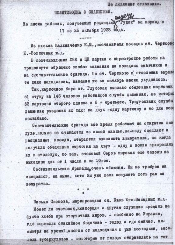 Политсводка о снабжении из писем рабочих, полученных редакцией "Гудок" за период с 17 по 26 октября 1933 года