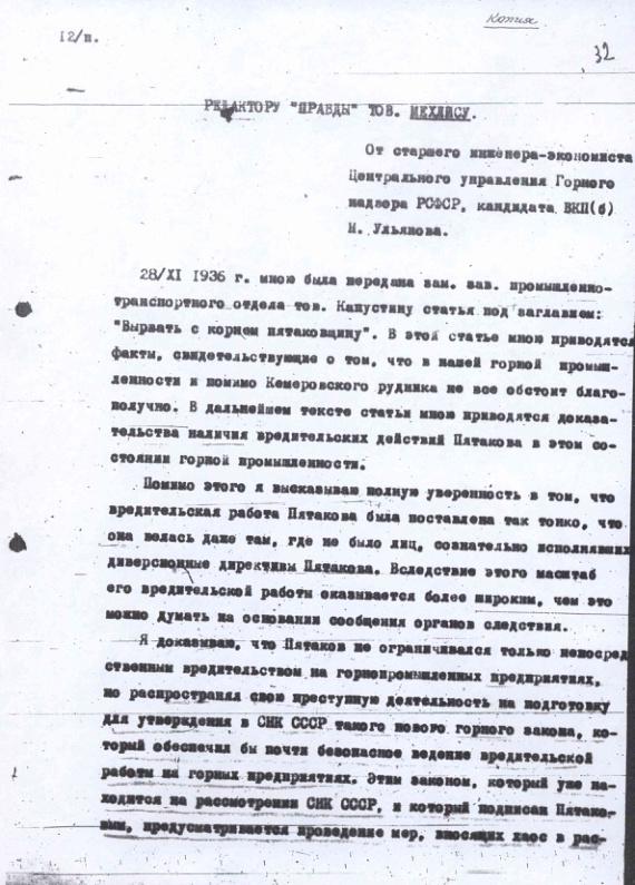 Письмо старшего инженера-экономиста Центрального управления Горного надзора РСФСР Н.Ульянова о статье "Вырвать с корнем пятаковщину". 28 ноября 1936 г.