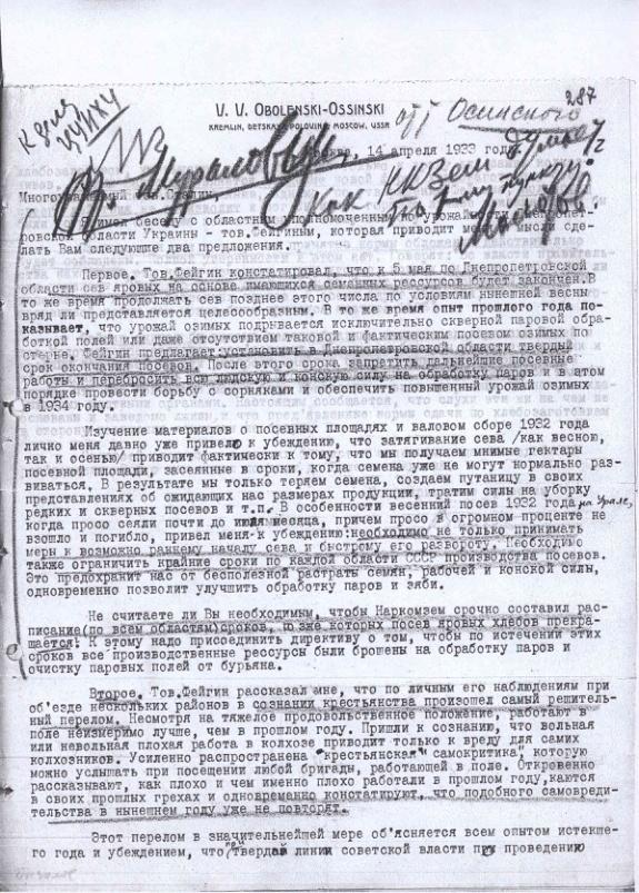 Записка председателя Центральной Государственной Комиссии по определению урожайности В.В.Осинского о посевной компании 1933 года. 14 апреля 1933 г.