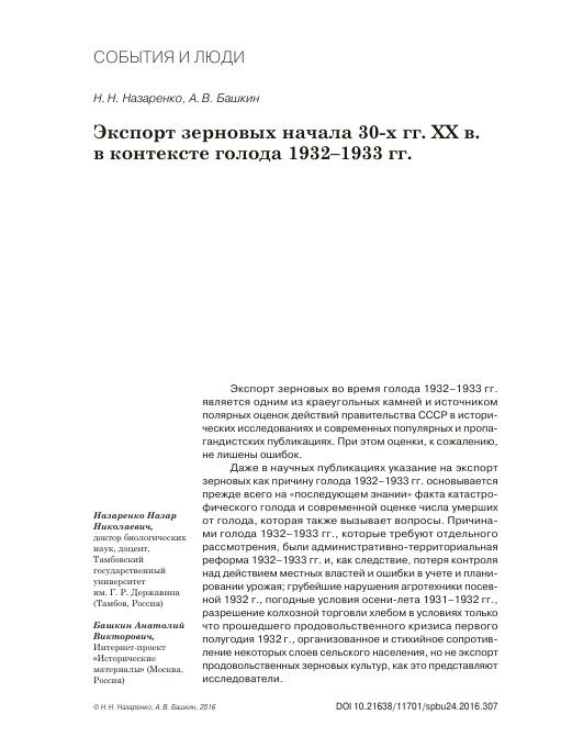 Экспорт зерновых начала 30‑х гг. ХХ в. в контексте голода 1932–1933 гг.
