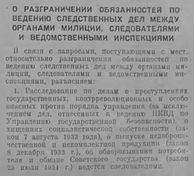 О разграничении обязанностей по ведению следственных дел между органами милиции, следователями и ведомственными инспекциями. 8 января 1938 г.