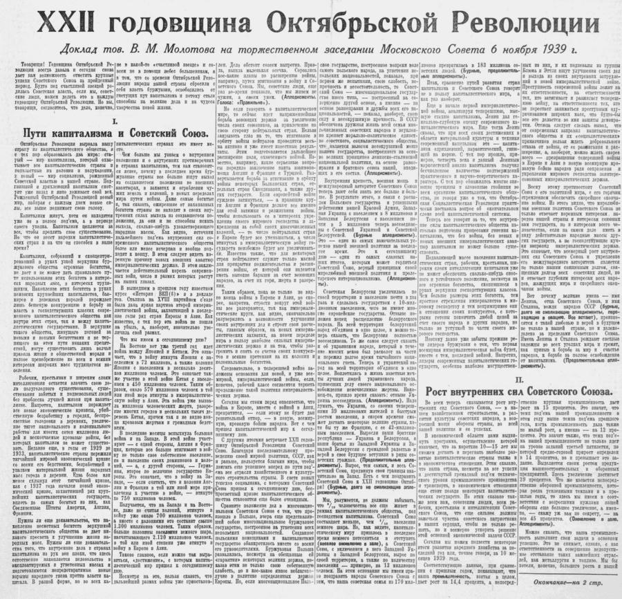 Доклад тов. В.М. Молотова на торжественном заседании Московского Совета 6 ноября 1939 г. XXII годовщина Октябрьской революции.