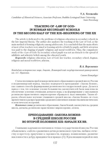 Преподавание «Закона Божия» в средней школе России во второй половине XIX–начале ХХ вв.