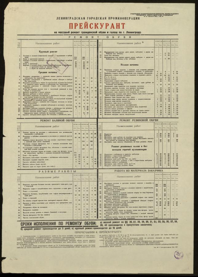Прейскурант на массовый ремонт гражданской обуви и галош по г. Ленинграду № 74 от 27 августа 1942 г.