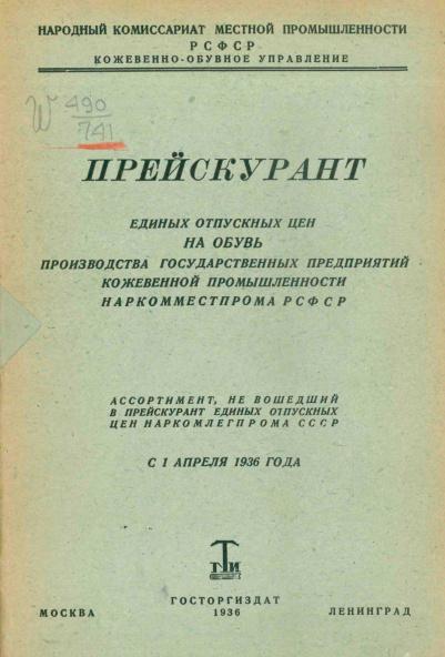 Прейскурант единых отпускных цен на обувь производства государственных предприятий кожевенной промышленности Наркомместпрома РСФСР. 1936 г.