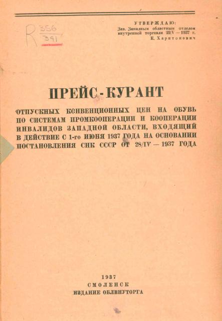 Прейс-курант отпускных конвенционных цен на обувь по системам промкооперации и кооперации инвалидов Западной области, входящий в действие с 1 июня 1937 года на основании Постановления СНК СССР от 28/IV – 1937 года