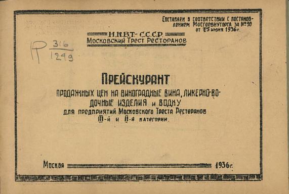 Прейскурант продажных цен на виноградные вина, ликеро-водочные изделия и водку для предприятий московского треста ресторанов III и II категории. 1936 г.